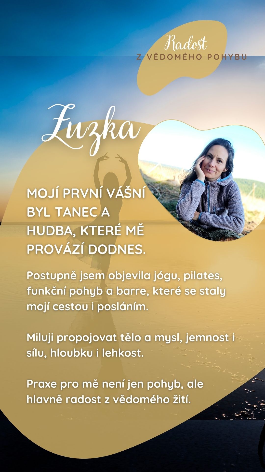 Ahoj, jsem Zuzka vcelku stejná, jako vy. Možná mám jen jiné zkušenosti a vnímání. Zprvu jsem se věnovala tanci, ale miluji pohyb snad ve všech jeho formách, ovšem nejvíc je to chůze a tanec. Ráda předávám nabyté vědomosti svým klientům, tak aby je pochopili a třeba i začlenili do jejich každodenního režimu. Neučím jen správné provedení samotných pozic, cviků, ale především se snažím poukázat na prožitek a radost z pohybu a množství získané energie, pramenící ze zklidnění své mysli, nebo příjemného odpočinku. Myslím, že funkčním pohybem v dnešní době dokážeme zpomalit a uvědomovat si více sami sebe, vůbec být schopni být sami se sebou.